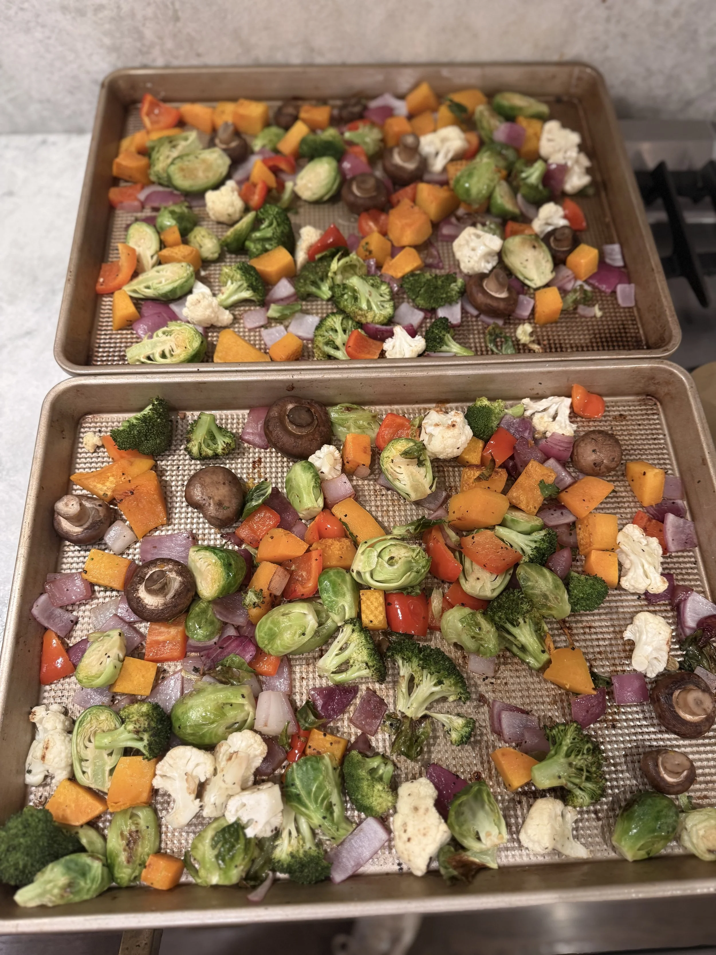 If you want to eat better during the week without overthinking it… start here. Every Sunday (or whatever day feels like your reset day), roast two big sheet pans of vegetables.